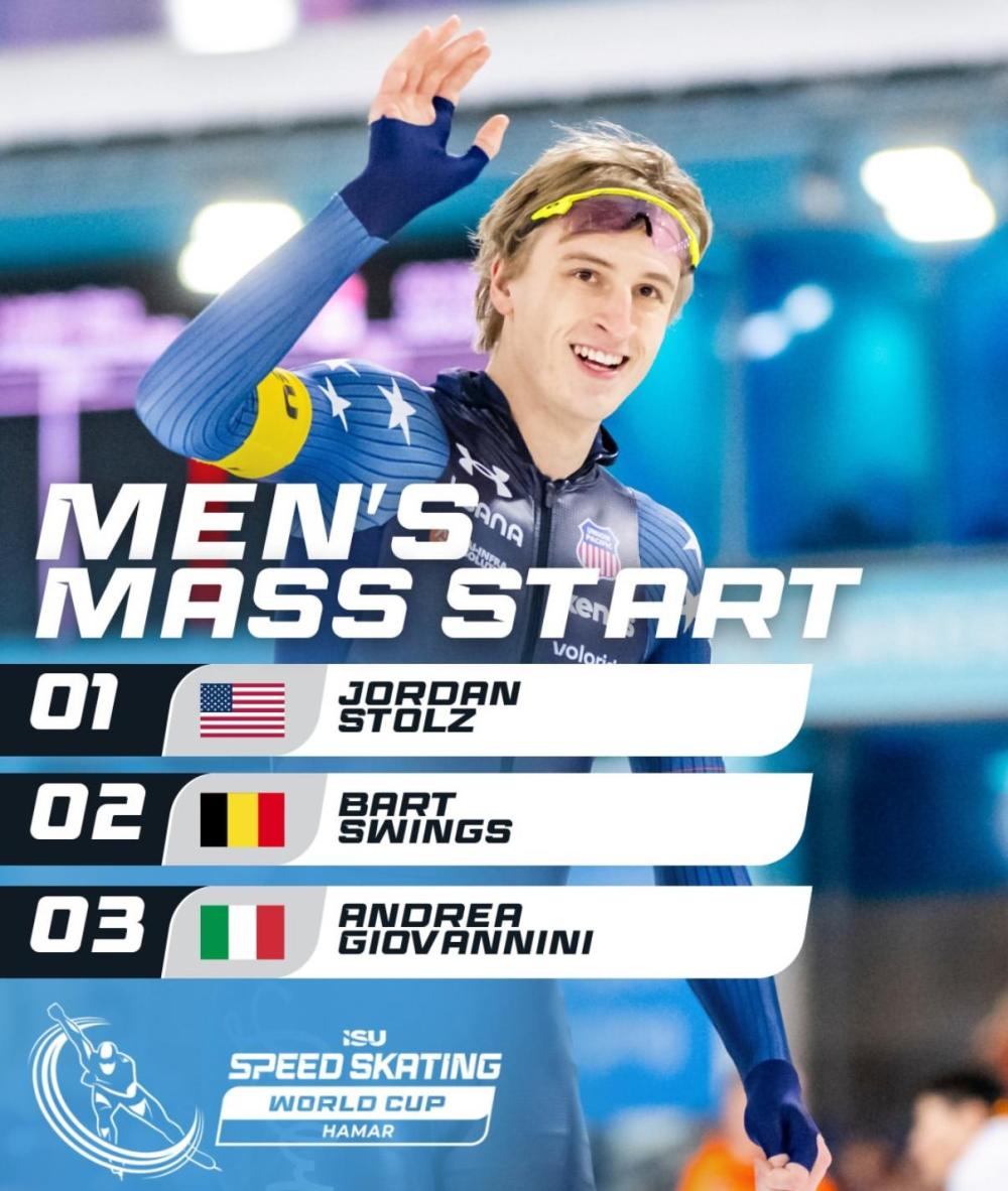 圖為國際滑聯發布的關于斯托爾茲獲得男子集體出發項目金牌的海報。圖片來自國際滑聯官方社交媒體賬號