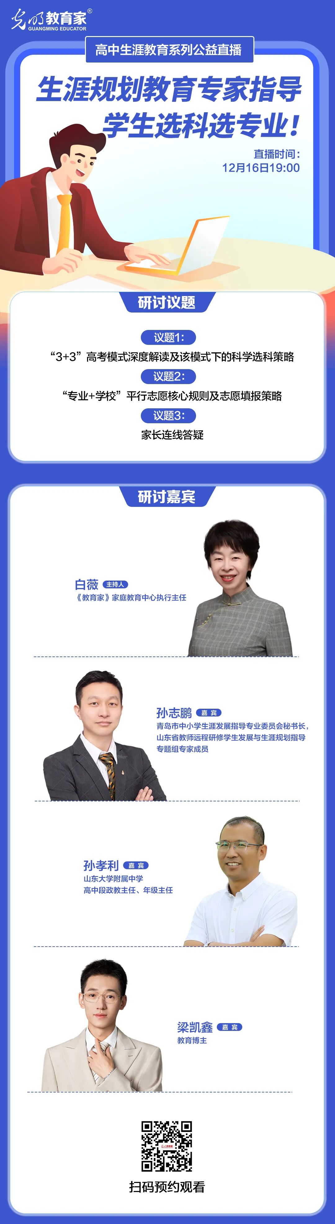 《教育家》發(fā)起生涯規(guī)劃教育公益直播,邀請地區(qū)、學校生涯教育專家及高校招生辦主任、中學校長等,進行科學、專業(yè)的選科指導、專業(yè)指導、發(fā)展建議,避免盲目選科選專業(yè),幫學生找到合適的發(fā)展路徑。