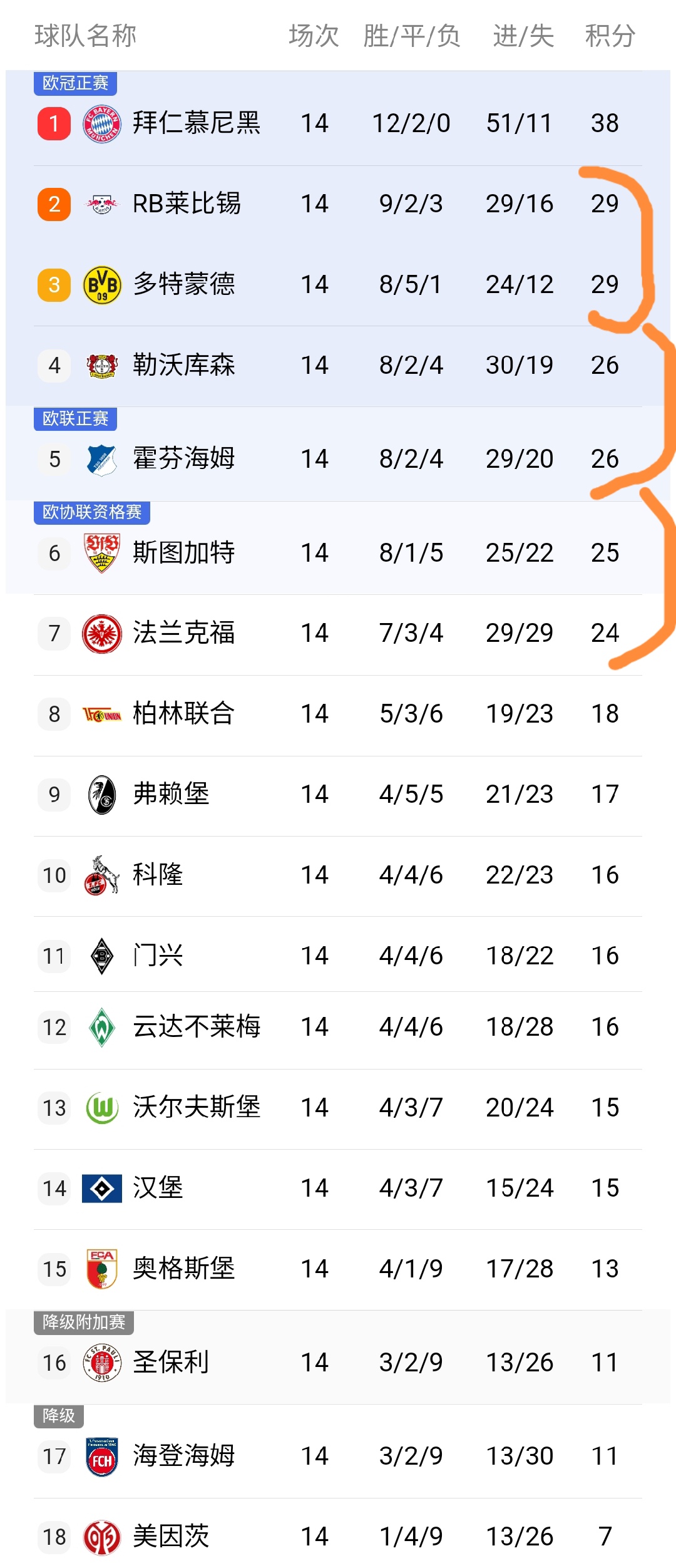 萊比錫和多特都是積29分,可以說萊比錫和多特蒙德處于第二集團,他們處于爭奪歐冠席位的有利位置,而勒沃庫森和霍芬海姆、斯圖加特、法蘭克福處于第三集團。可以看到第2和第7的分差僅4分,萊比錫、多特、勒沃庫森、霍芬海姆、斯圖加特、法蘭克福這些球隊將爭奪三個歐冠席位,所以除了冠軍幾乎沒有懸念之外,歐冠席位的爭奪還是很有懸念的。看德甲也就是看誰能拿到歐冠席位。因為歐冠席位的爭奪異常激烈啊。