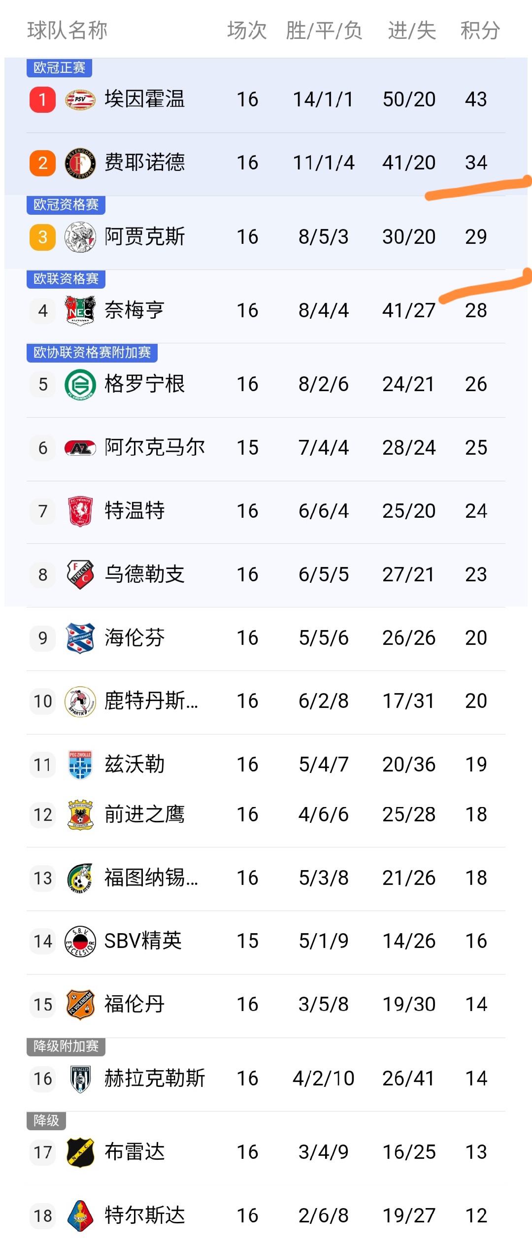 可以看到歐冠1冠王埃因霍溫目前在荷甲強勢領跑,可謂是一枝獨秀啊,因為埃因霍溫隊16輪僅輸1場,同時僅平1場,其余比賽全部取得勝利,是所有球隊中取得勝利場數最多的,而且輸球場數最少的,所以埃因霍溫以43分領跑,領先了第2的范佩西執教的費耶諾德隊9分之多,馬上就要達到兩位數的領先優勢。