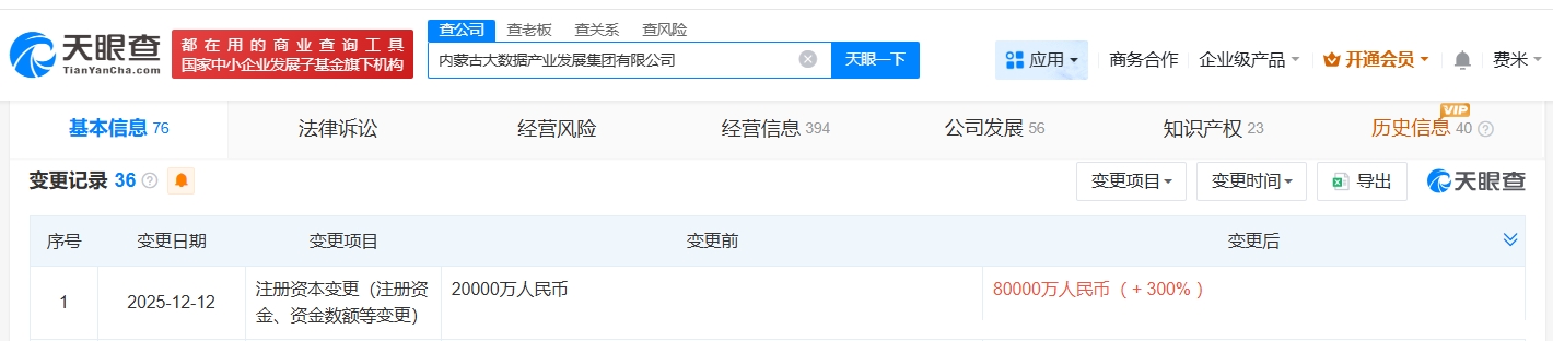 天眼查App顯示,近日,內蒙古大數據產業發展集團有限公司發生工商變更,注冊資本由2億人民幣增至8億人民幣,增幅300%…