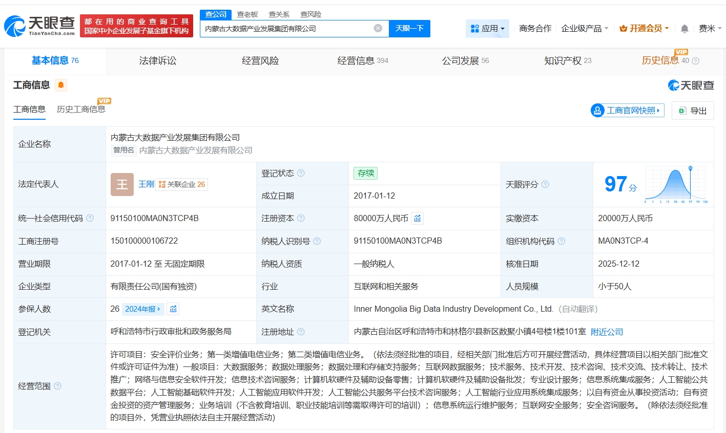 該公司成立于2017年1月,法定代表人為王剛,經營范圍包括安全評價業務、第一類增值電信業務、第二類增值電信業務、大數據服務等,由呼和浩特市國有資產監督管理委員會全資持股。