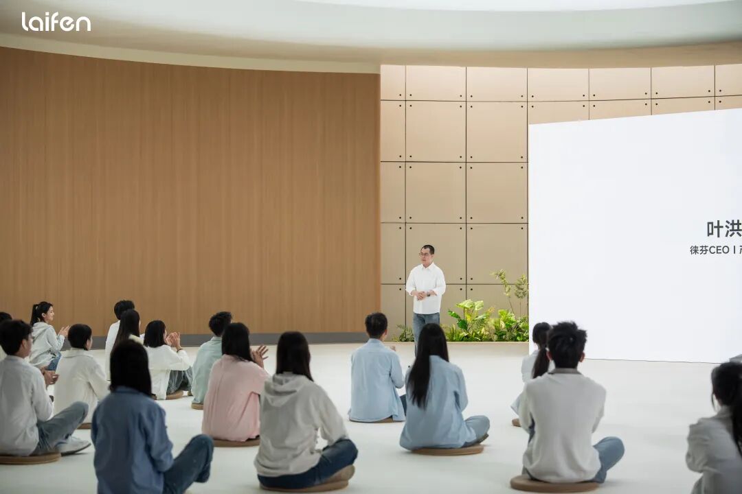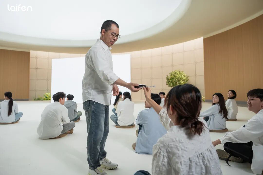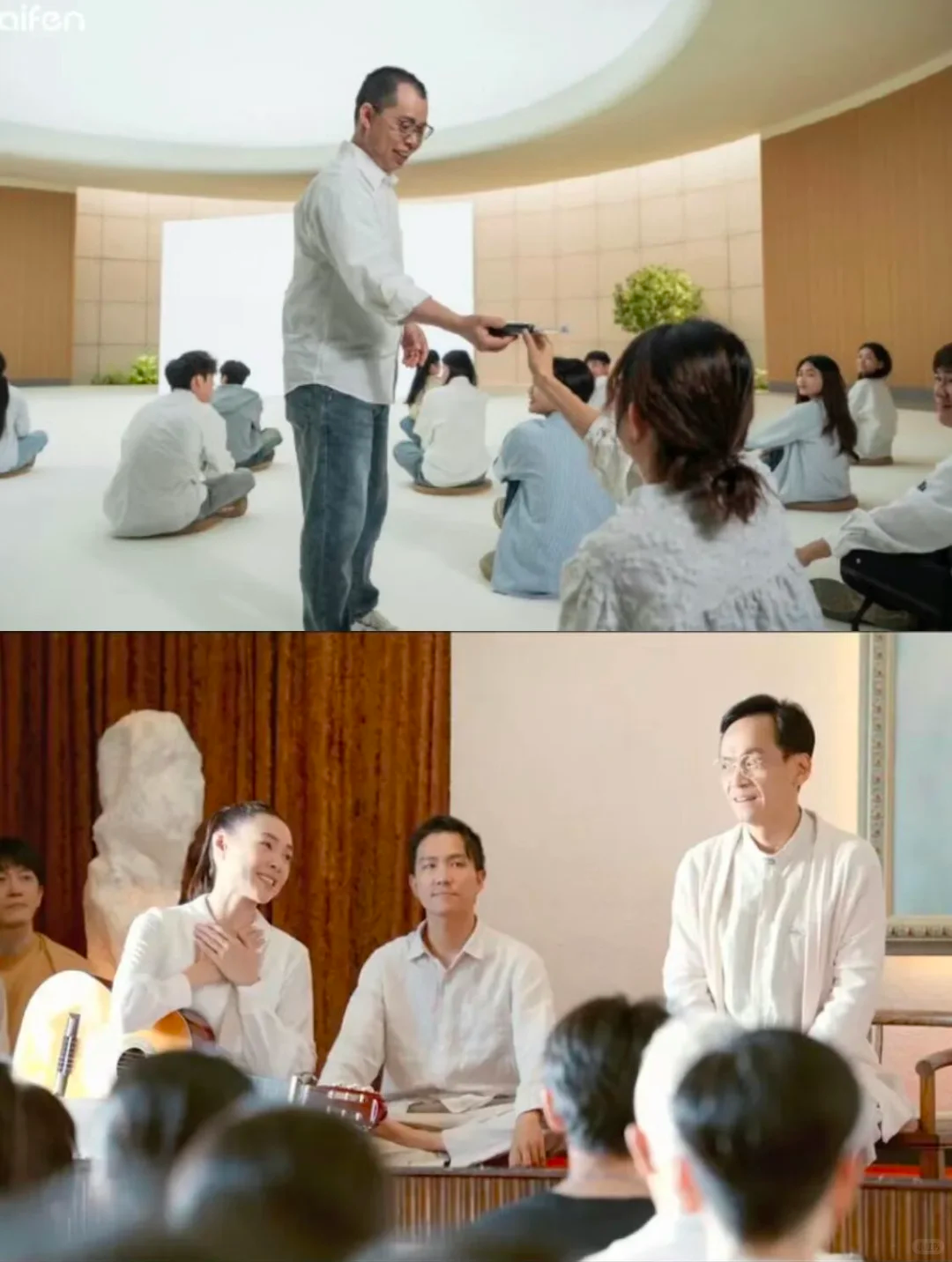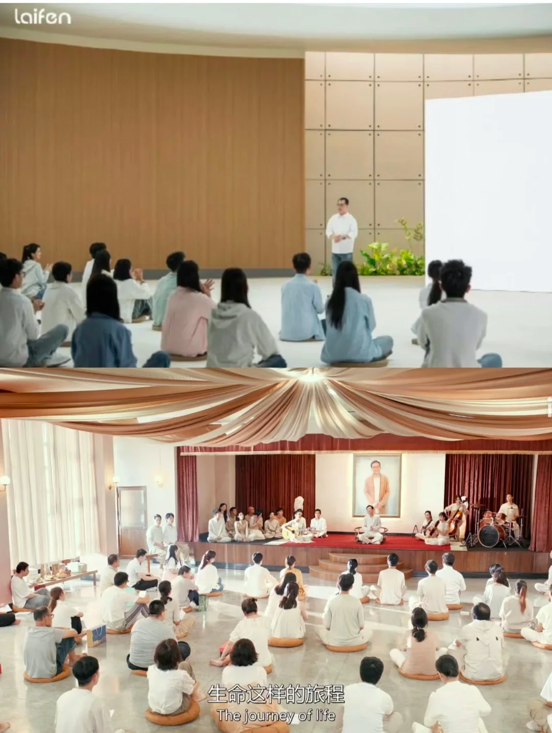 事情的起因,是徠芬創始人葉洪新在微博分享的一組預熱照。極簡風的場地里,一群人盤腿坐在蒲團上,圍著主講人認真聆聽,熟悉電影的網友 DNA 直接動了:“滿腦子都是‘曾經… 我茫然前行’!”“這不是尊者操控信徒的名場面復刻嗎?”