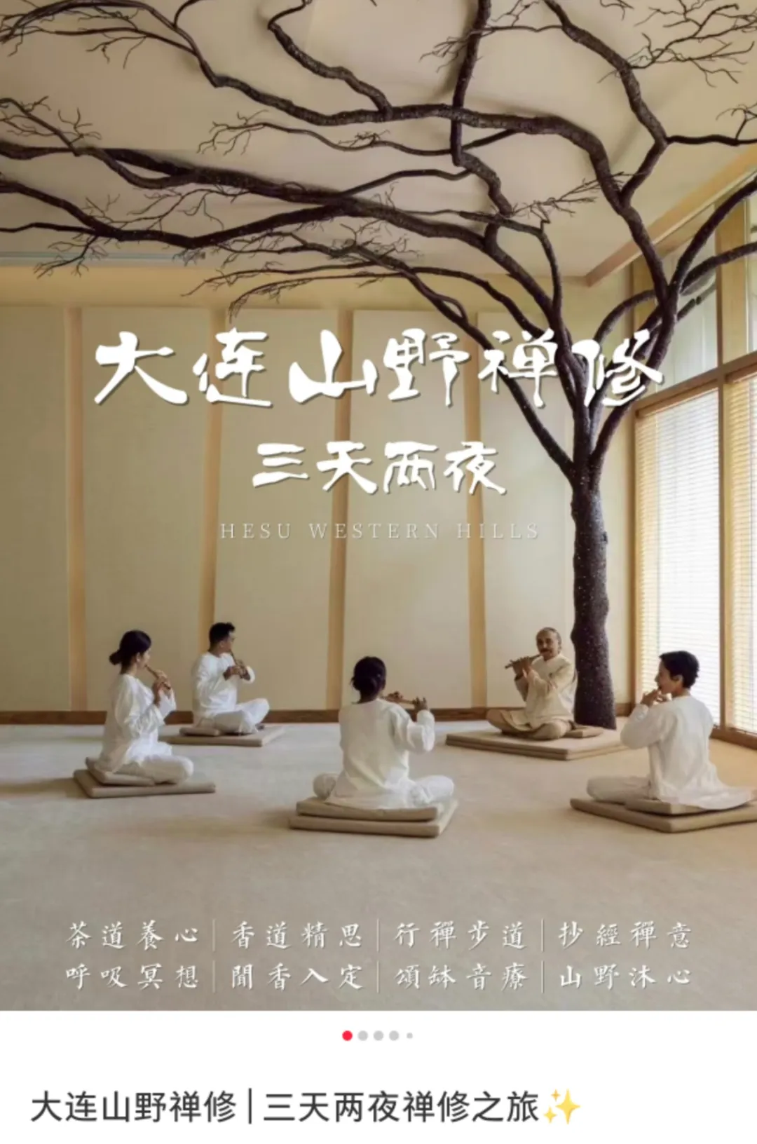其實這種視覺語言并不少見,自然光線、淺色極簡布置、棉麻質感,再加上天地人融合的圓形構圖,隨便翻個禪修班招生廣告都能看到。