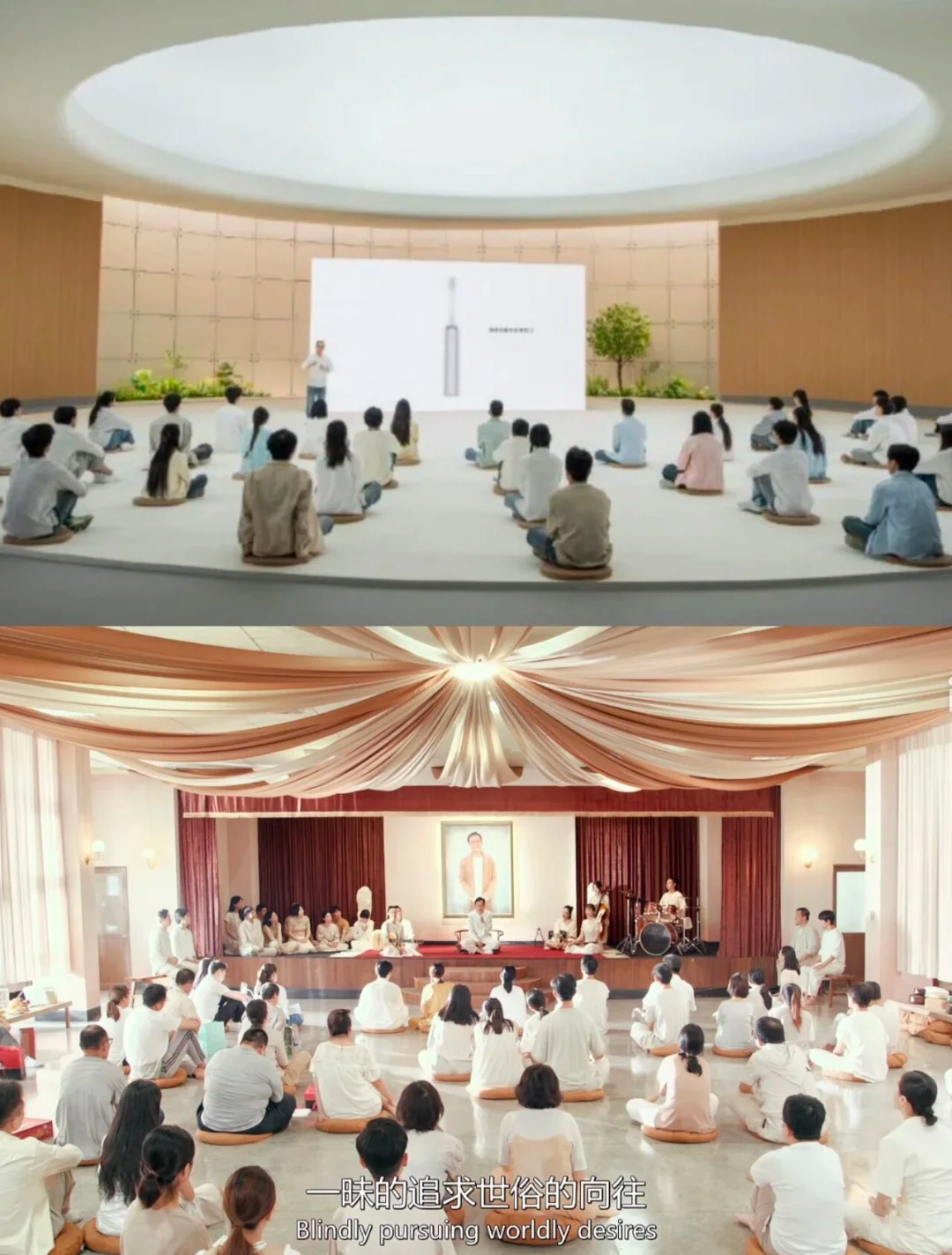 刷到徠芬新品發布會的預熱圖,不少人瞬間脊背發涼 —— 環形圍坐的蒲團、居中講解的創始人、暖光籠罩的禪意布景,這畫面和《周處除三害》里讓人細思極恐的邪教靈修名場面,簡直一模一樣!