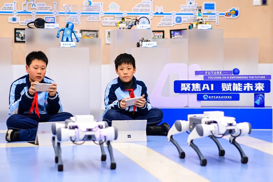 12月2日,杭州市保俶塔實驗學校的學生們在人工智能通識課上學習如何給機器狗編程。新華社發