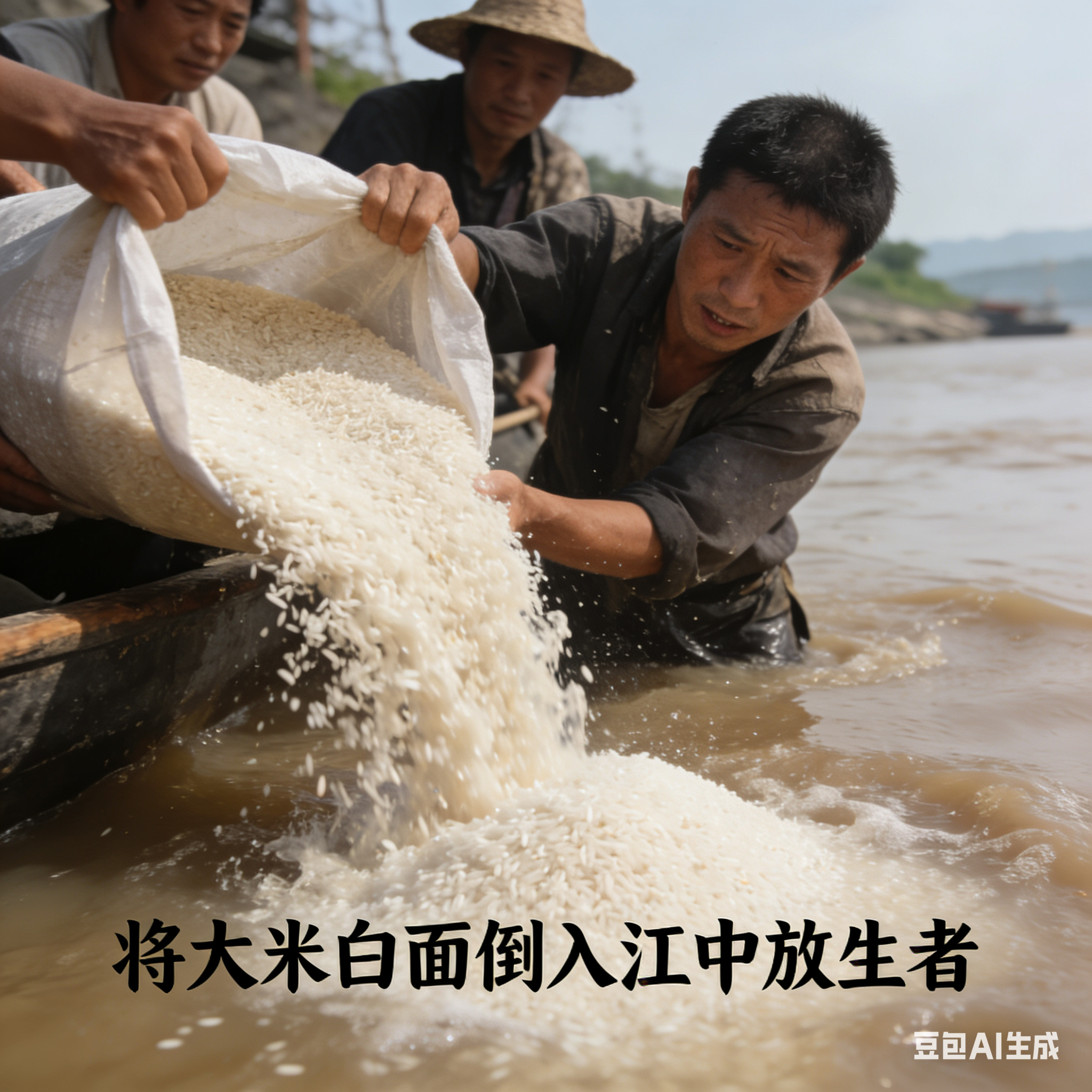 近聞有將大米白面倒入江中放生者,心甚忿之,特吟小詩一首討之。