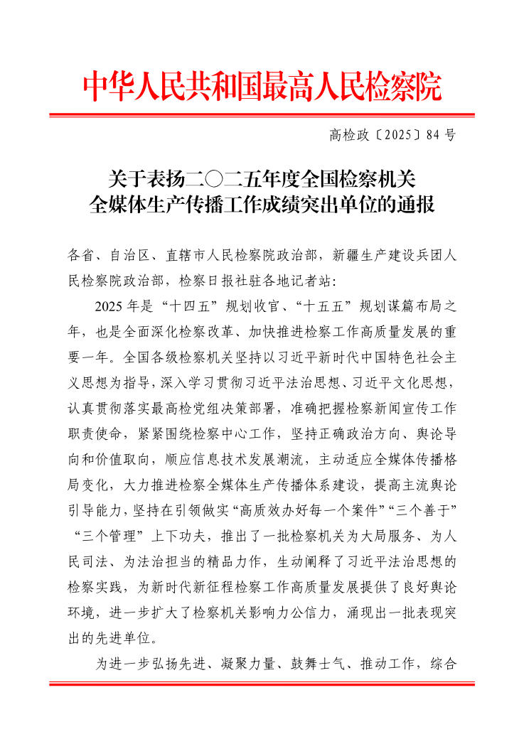 駐馬店市5個檢察院獲“二〇二五年度全國檢察機(jī)關(guān)全媒體生產(chǎn)傳播工作成績突出單位”