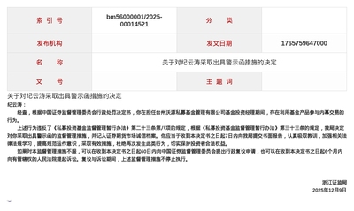 上述行為違反了《私募投資基金監督管理暫行辦法》《證券期貨經營機構私募資產管理業務運作管理暫行規定》相關規定。浙江證監局決定對德裕嘉鴻采取出具警示函的監督管理措施,并記入證券期貨市場誠信檔案。