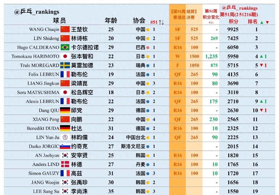 隨著2025年香港總決賽的結束,2025年最終的世界排名出來了。王楚欽這次以9925分排名第一,積分沒有增加。王楚欽這次因為受傷的原因沒有打進決賽,依然打進了四強很不容易。去年他在總決賽奪冠,今年止步半決賽所以沒有積分增加。王楚欽目前是國乒的核心選手,這次身兼多項參加總決賽,確實比較勞累,估計他要休息一段時間了。