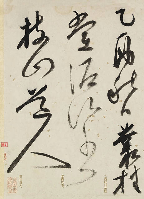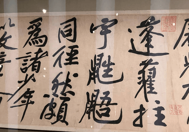 “宋四家”之一的黃庭堅行書紙本《贈張大同卷跋尾》,亦稱《為甥張大同書卷》。書于元符三年(1100年)正月,鈐有“紹興”“內府書印”等印記。這件作品是現存僅有的五件黃庭堅大字行書墨跡之一,堪稱其書法藝術生涯的巔峰之作。其筆法展現出他沉著凝定的運筆控制與細微而緊繃的筆勢,這些特質共同造就了字形中修長而富于張力的筆畫。