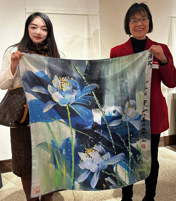 (圖為師帥會長向美國國立亞洲藝術博物館東亞文化研究所贈送湘西書畫家雷雨田“中古荷魂”文創絲巾,右為美國國立亞洲藝術博物館東亞文化研究所資深研究員劉嫄博士)
