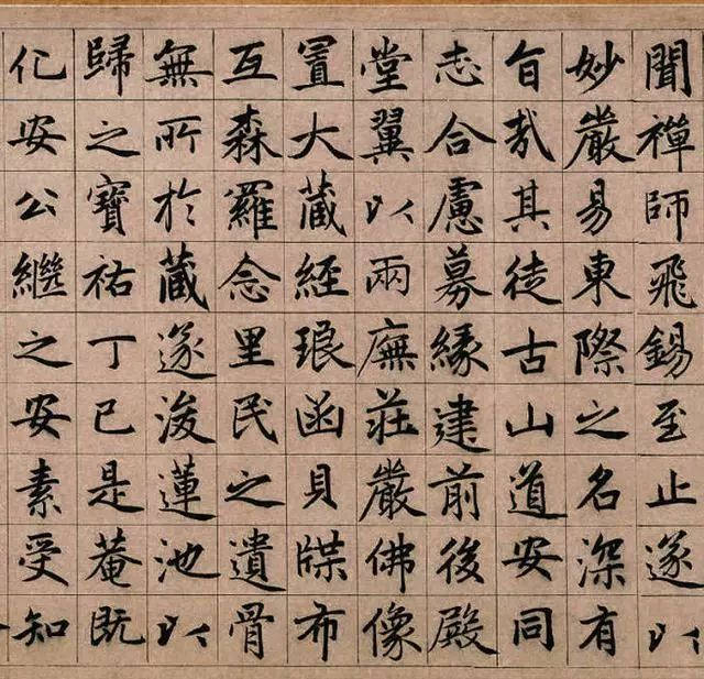趙孟頫書法自成一派,世稱“趙體”或“松雪體”,留下大量書作,在中國書法史上具有承上啟下的作用,憑借其個人魅力,聚集了一大批書家,影響了整個元代的書法,是元代書法的最杰出代表,憑借文藝、書畫而得到元幾代帝王的賞識,官至一品。 《湖州妙嚴寺記》卷首趙氏自書小篆題額,正文楷書秀麗端莊,法度大氣,筆勢舒展靈活精妙。具有極高的書法造詣,是后人研習趙氏楷書的最佳范本。此卷為趙孟頫楷書典型之風格,中正內斂、法度精嚴。楷書中帶有行意,動靜相合。觀此卷書法,一是在用筆上,將晉唐各家精髓糅合得恰到好處,不露痕跡。二是結構上規整有度,開合適當。三是風格上剛柔相濟,以柔為主,綿中有針。