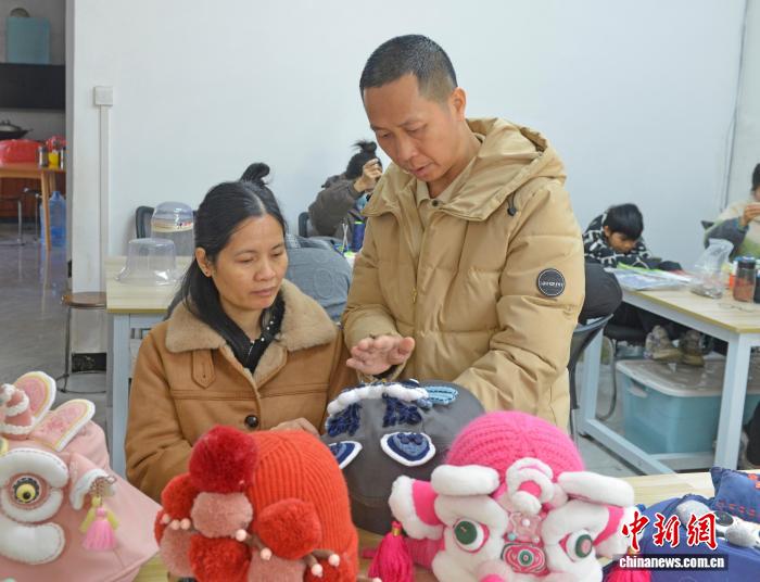 12月14日,何繼文(右)正在檢查工人繡好的產品。滕忠 攝