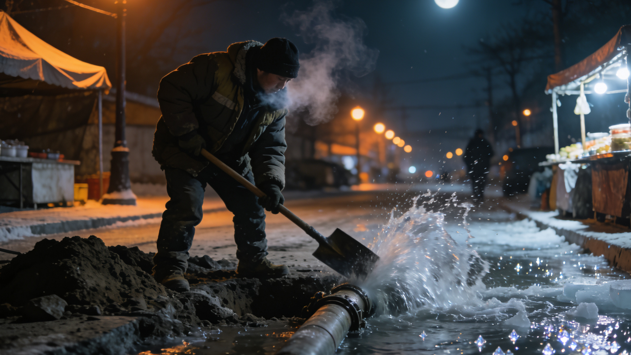 “有救了!”兒子蹦下床,光著腳丫跑到廚房,冰涼的小腳掌踩在地板上“啪嗒”響,小手在碗邊比劃著,“爸爸,這水像小瀑布一樣,就是太細啦,比奶奶縫衣服的真絲線還細。”后來才知道,是搶修工人記掛著居民沒水做飯,特意臨時開了閥門放了會兒水。早上出門送兒子上學時,樓下便利店門口排起了短隊,大家都在買礦泉水和面包,圓臉的中年老板系著油污的圍裙,一邊麻利地掃碼遞貨,一邊扯著嗓子喊:“別急別急,都有呢!礦泉水、全麥面包、真空鹵蛋,搶修師傅說中午就能通水,大家先湊活對付下!”他的聲音裹著熱氣,驅散了幾分寒意。不遠處的施工圍擋旁,幾個工人蹲在路邊啃饅頭,塑料袋子里裝著咸菜,臉上沾著泥點,雙手凍得通紅,指關節粗糙開裂,像老樹皮一樣,指尖還沾著水泥漬,像抹了層紅顏料。其中一個師傅看到路過的居民,揚了揚手里的饅頭笑著說:“放心,水很快通,先放這點水讓大家應急做飯,不耽誤吃早飯!”他的棉鞋上還沾著冰碴,褲腳卷著,露出的腳踝凍得發紅,說話時嘴里的白氣裹著熱氣散開,帶著淡淡的饅頭麥香,看得我心里一陣發熱——原來寒冷的冬日里,陌生人的善意總能輕易溫暖人心。