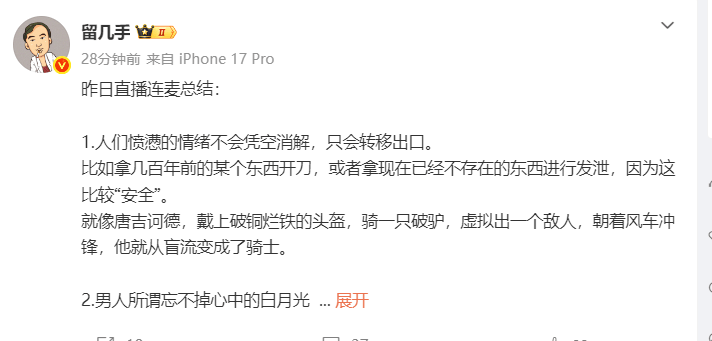 搜狐娛樂訊 12月15日,網紅留幾手發文分享直播連麥總結,談及情感,他直言 “男人說忘不掉白月光是借口,真忘不掉根本不會開始新關系”;聊到婚戀,稱 “做江浙閩女婿最幸?!?,理由是當地民間資本雄厚、獨生女無算計,還對比稱 “上海瞧不上外地人、珠三角潮汕重男輕女”;同時涉及留學、拖延癥等話題,比如建議家境不富裕者別去澳英加留學,稱 “和國內二本沒區別”。
