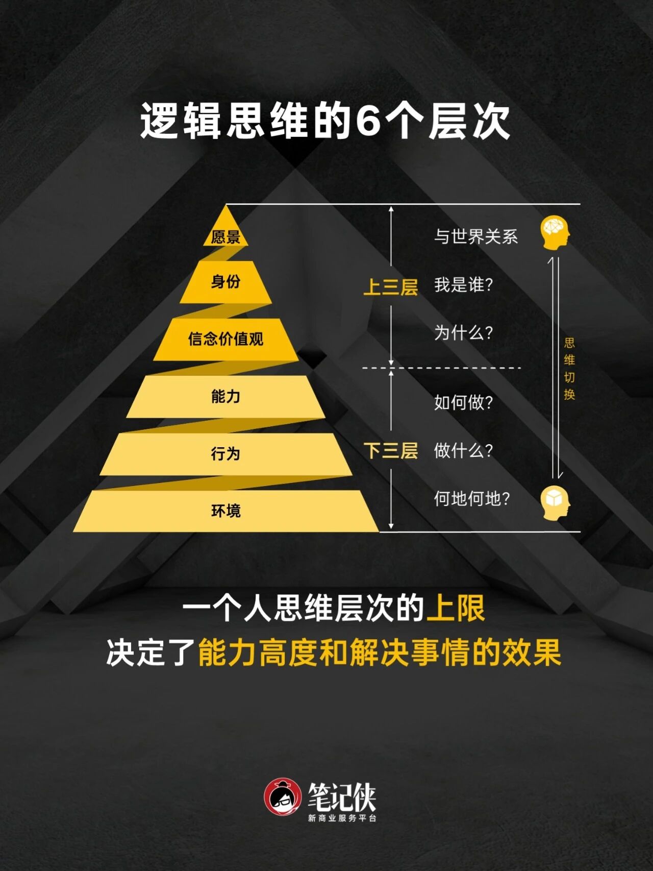 NLP領域的大師羅伯特?迪爾茨把人的邏輯思維分為6個層次,從下到上分別為:環境層、行為層、能力層、信念/價值觀層、身份層與愿景層。不同的層次,有不同的關注點。一個人的思維會在不同層次間切換。
