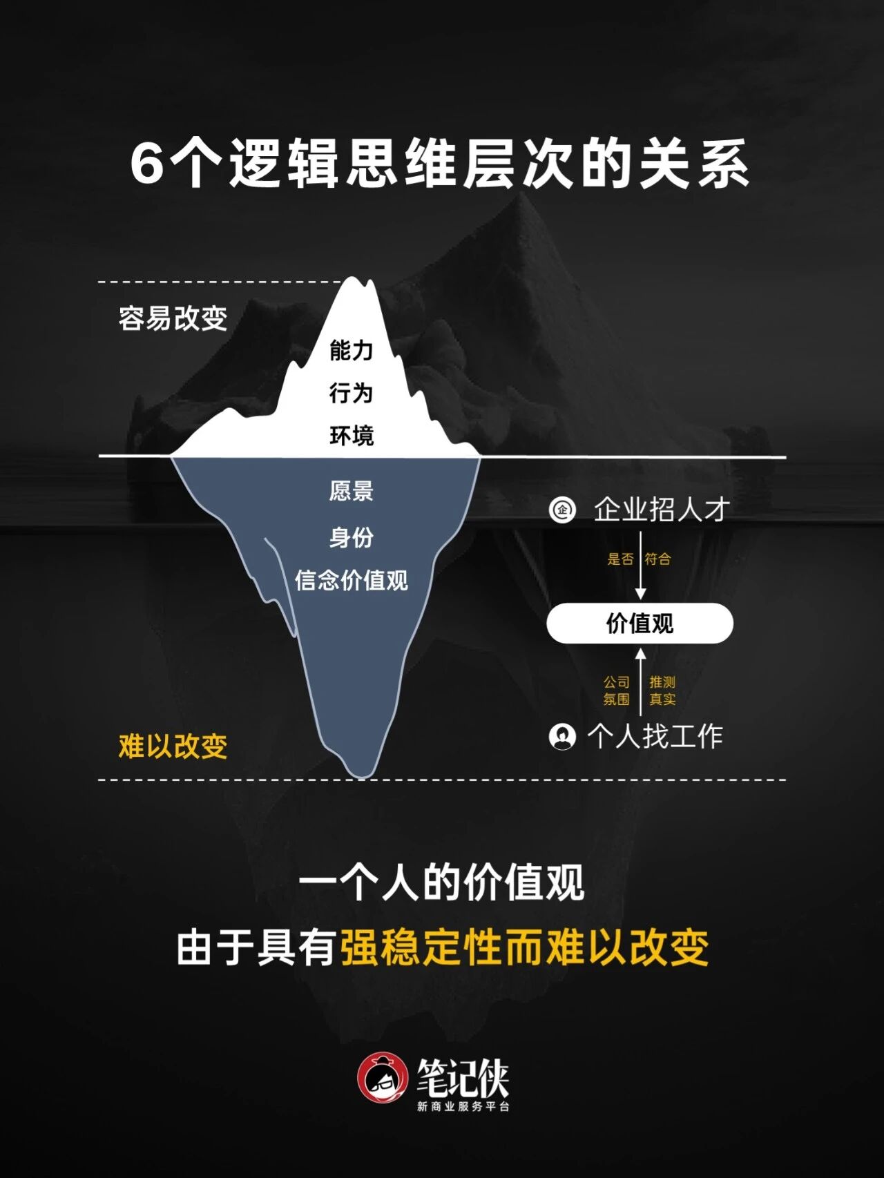 用冰山模型看思維層次,下三層在冰山之上,容易改變;上三層在冰山之下,難以改變。由于一個人的價值觀具有很強的穩定性而難以改變,所以企業招人才,要優先考察他的底層價值觀是否適合企業的使命愿景價值觀;個人找工作,也要通過公司氛圍推測企業真實的價值觀文化,來做更好的選擇。
