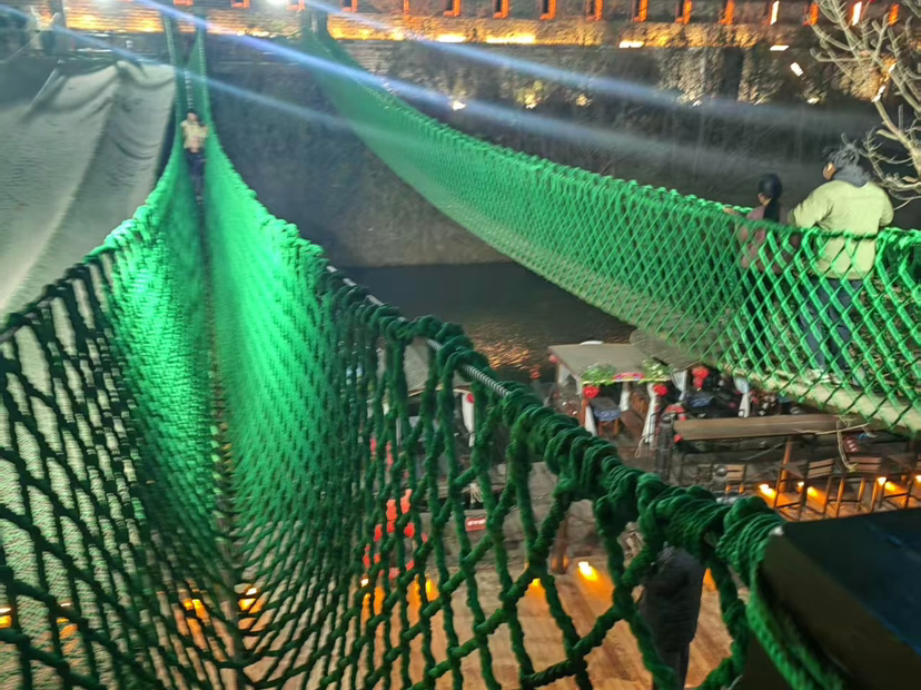 剛喘口氣,我就發現我還要再走回去。這次不能原路返回,而有兩條路,一條路就是兩邊的護欄還是粗繩編織的網,但是腳底就兩根并排的粗鋼筋繩;還有一條路倒是有木板,還很寬,但是沒有護欄,不過下面有網,就是掉下去,也不用擔心掉水里。