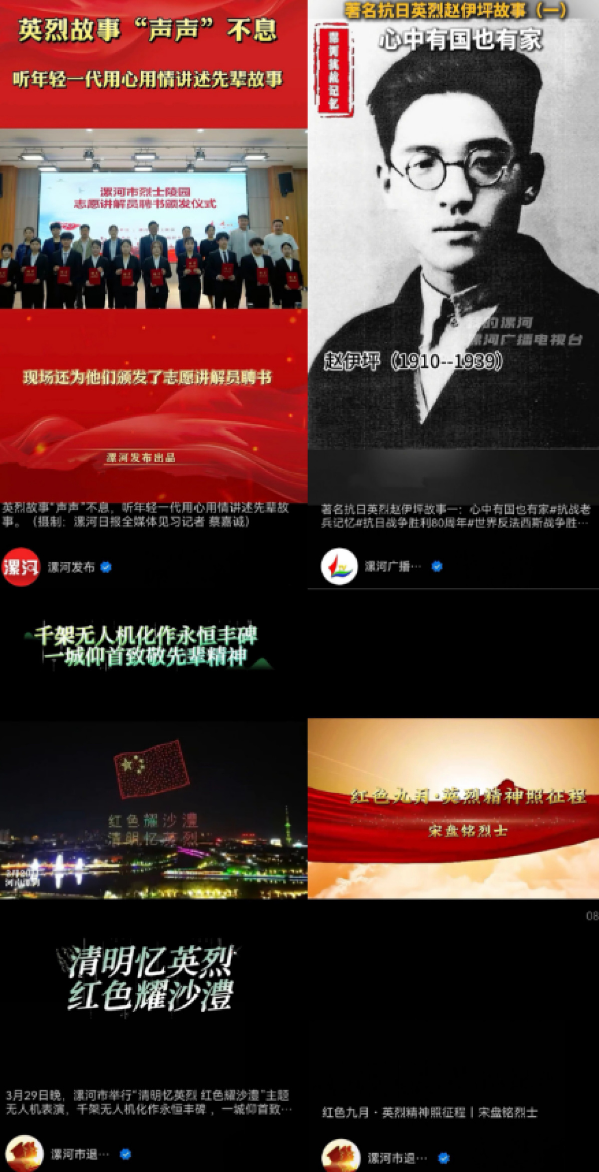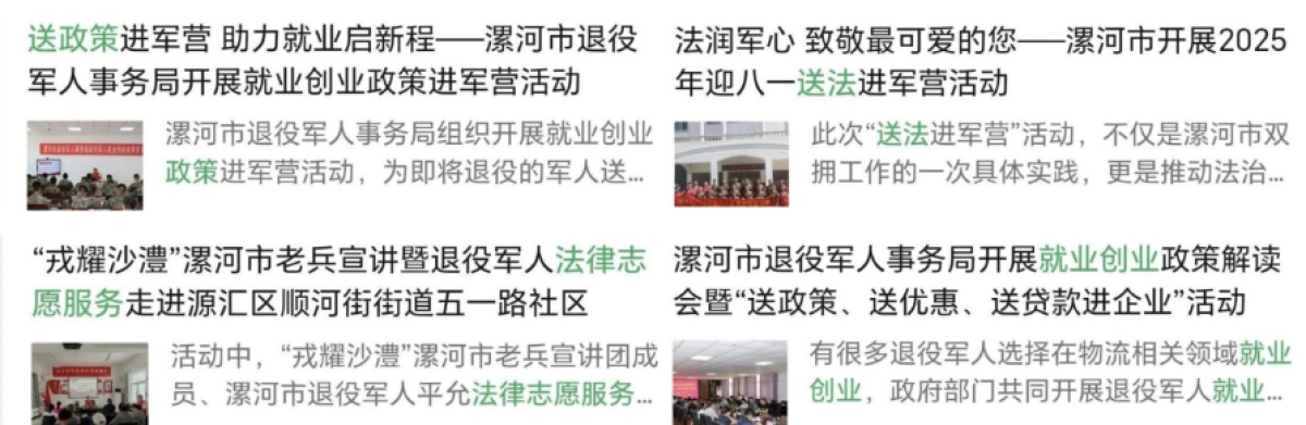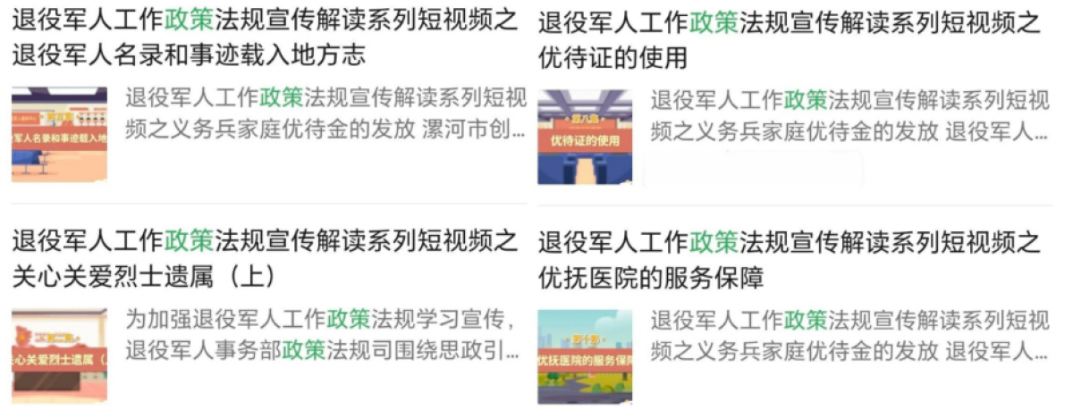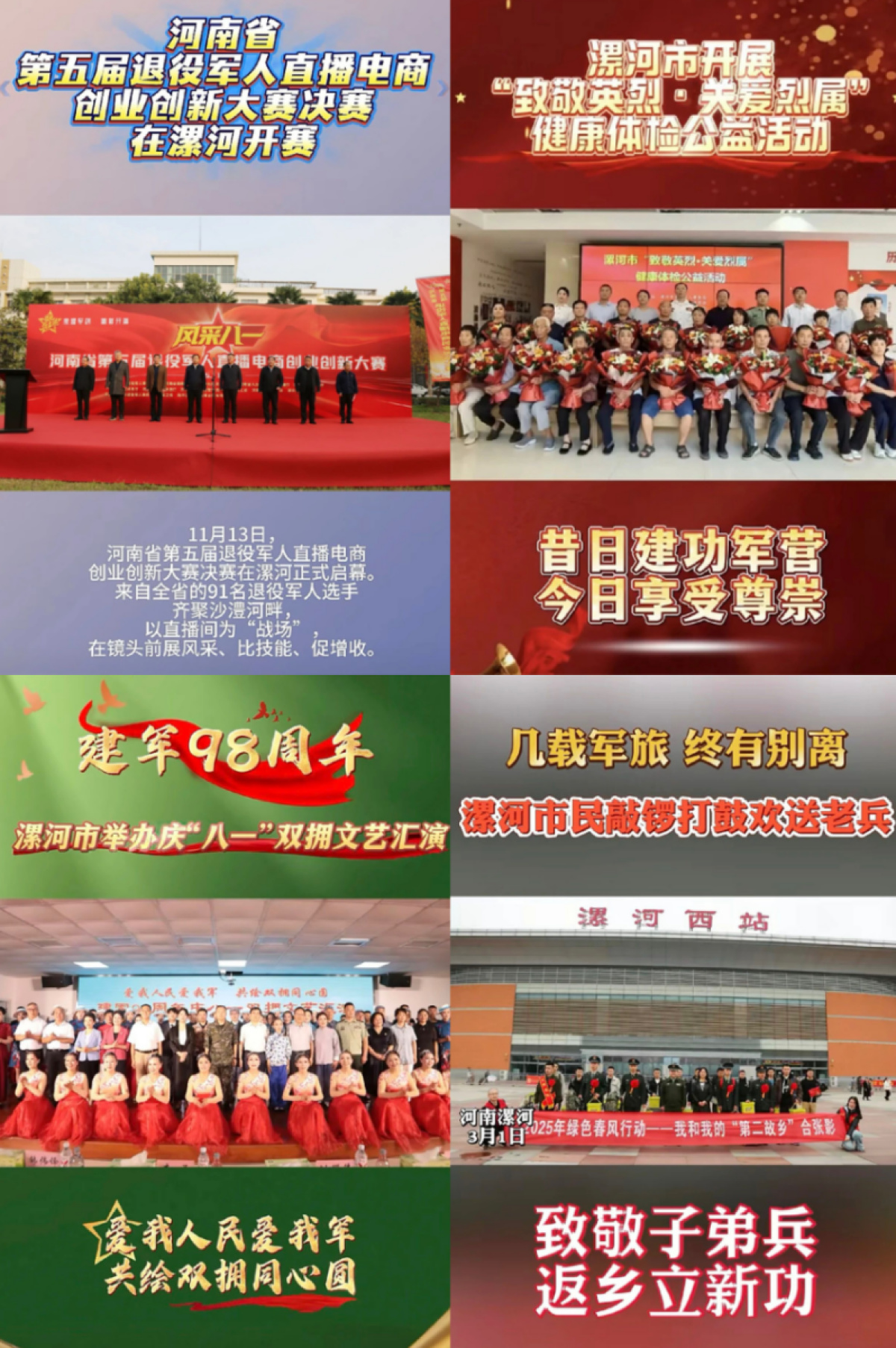 剪輯發(fā)布河南省第五屆退役軍人直播電商創(chuàng)業(yè)創(chuàng)新大賽決賽在漯河開賽、“致敬英烈 關(guān)愛烈屬”健康體檢公益活動、漯河市民敲鑼打鼓歡送老兵等視頻,營造尊軍崇軍的濃厚氛圍。