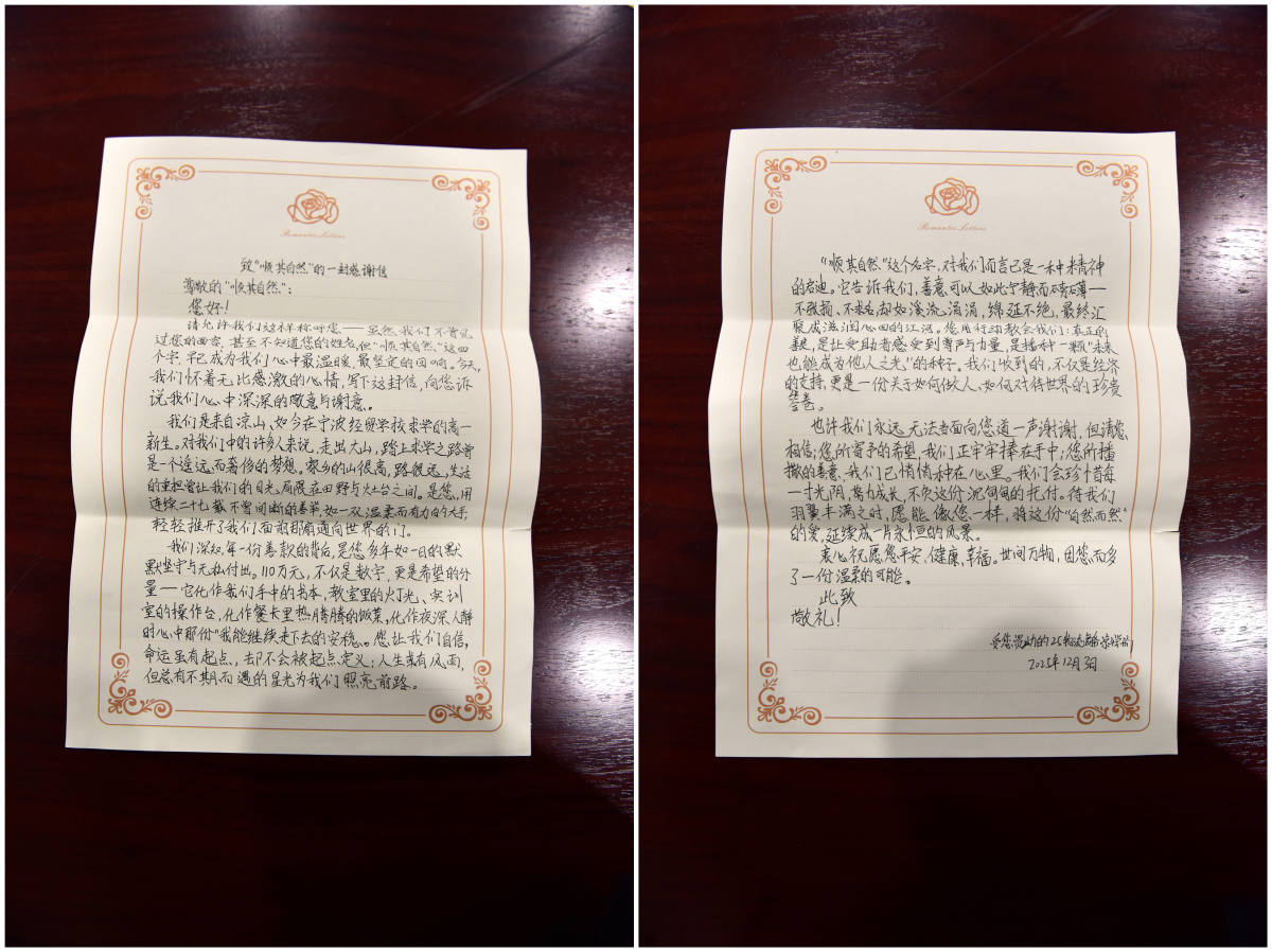 “這些信是孩子們在彝族傳統節日‘庫史節’期間寫的。學校組織了寫家書的活動,孩子們在向家人傾訴思念、遙送問候的同時,不少受助學子不約而同提筆,給‘順其自然’寫下了心底的話。更有一個班級特意提交了集體聯名信,以此傳遞濃濃的謝意。”