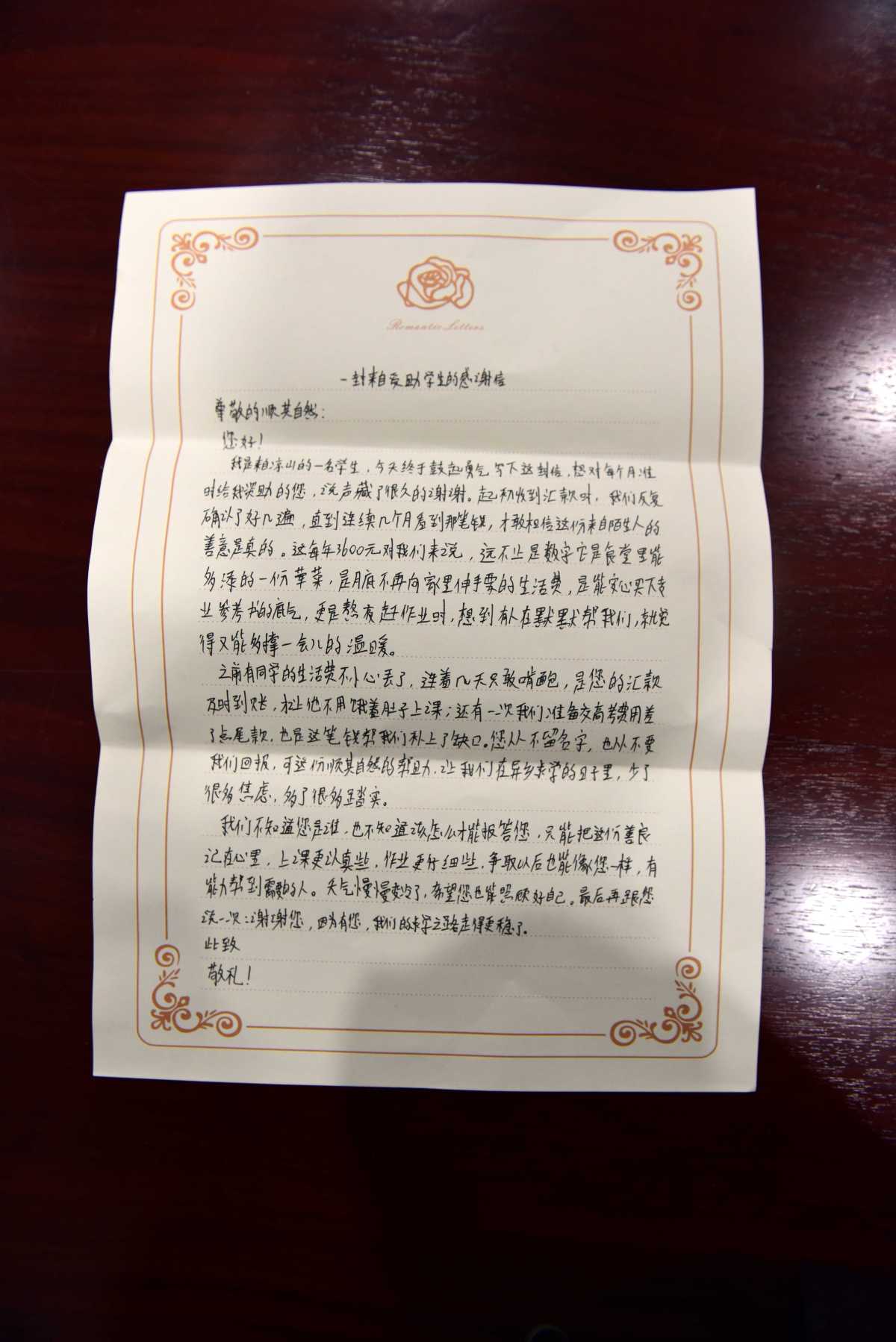 “雖然我們不曾見過您的面容,不知道您的姓名,但‘順其自然’這四個字,早已成為我們心中最溫暖、最堅定的回響。”其中一封感謝信的開頭,用樸實的語言表達了對“順其自然”的深深敬意。