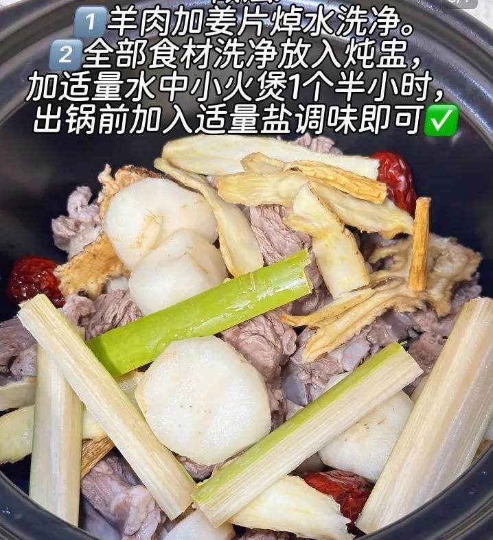 做法經(jīng)典:羊肉半斤切塊(選羊腩更嫩),焯水去腥,加當歸片10克、姜片幾塊,清水燉1小時。湯色乳白,香氣撲鼻,撒點鹽就開喝。