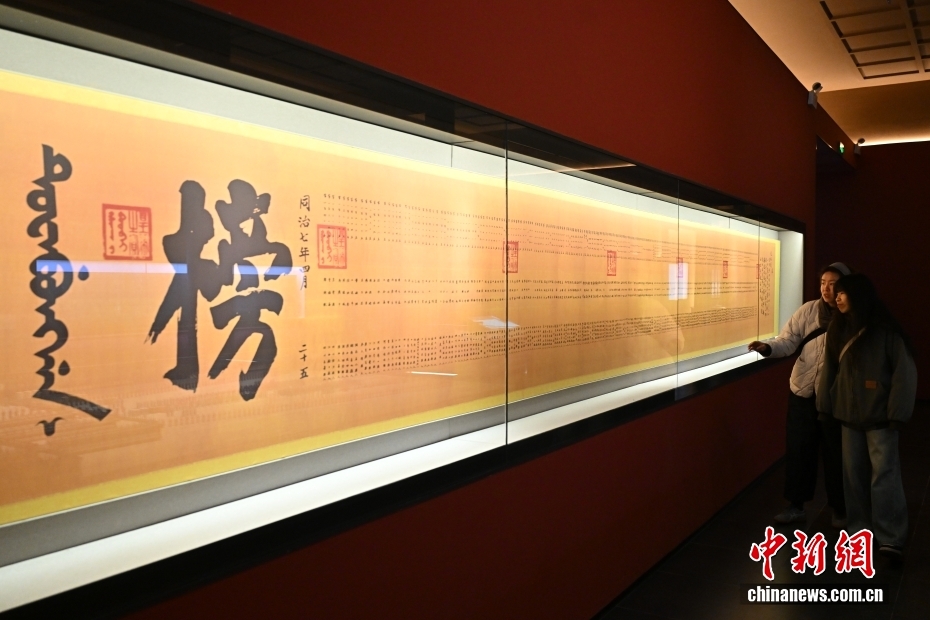 12月15日,北京,在“聚天下英才——中國古代科舉文化展”上,觀眾參觀“清同治七年(1868年)戊辰科大金榜”展示。該展覽位于孔廟和國子監(jiān)博物館,以科舉沿革、考選實踐、制度影響為脈絡,系統(tǒng)闡釋了中國古代科舉制度的千年嬗變及對中華文明與世界的深遠影響。展覽將于12月16日免費對公眾開放。