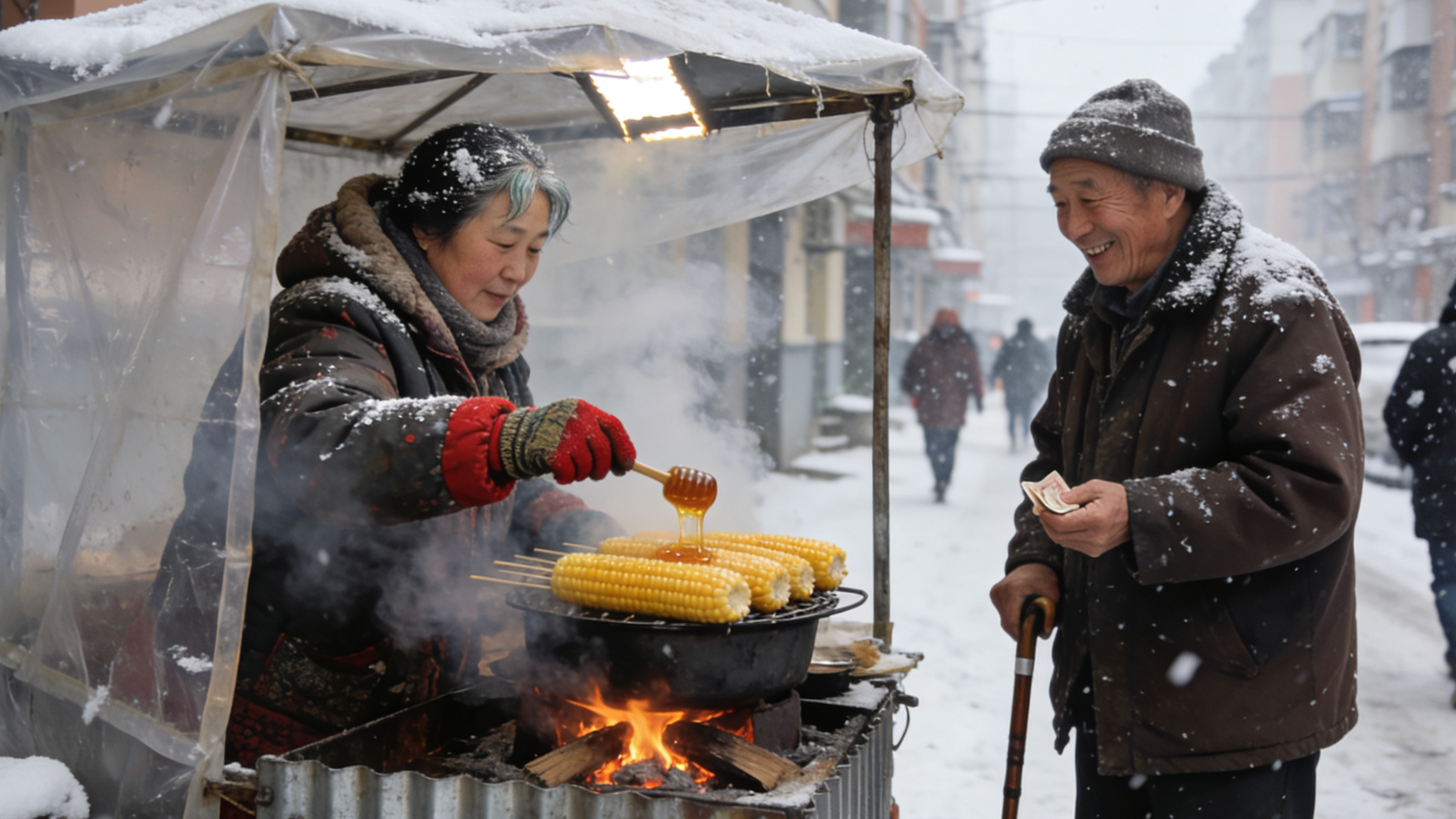 小小的玉米攤前,此刻圍了不少人。張大爺吃完一根,又買了兩根:“給我家老婆子也帶兩根,今天的玉米格外香!”剛才幫忙救火的小伙子笑著說(shuō):“阿姨,我買五根,給同事也帶點(diǎn),這么冷的天,吃根熱玉米太舒服了?!边€有路過(guò)的上班族、帶孩子的寶媽,都停下腳步買上一根,有人陪著李阿姨閑聊,有人還在幫她整理攤位,柴火的暖光映著一張張笑臉,雪沫子在燈光下飛舞,成了雪天里最動(dòng)人的風(fēng)景。