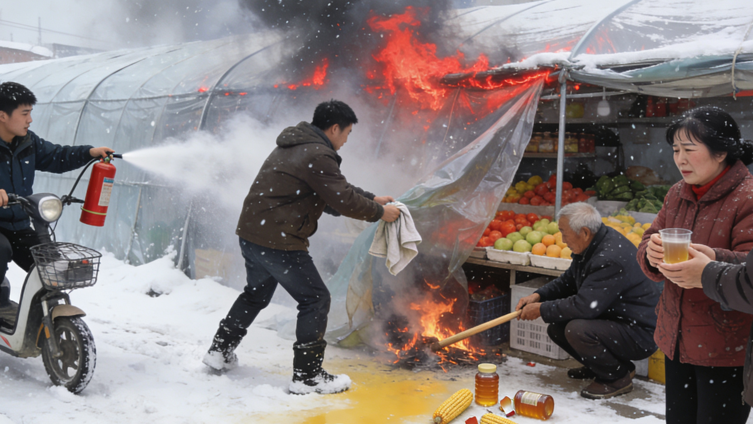 忽然間,狂風(fēng)驟起,卷起地上的雪沫子直撲過(guò)來(lái),塑料棚子被吹得“嘩嘩”作響,四角的石頭晃了晃,險(xiǎn)些被掀翻。沒(méi)等眾人反應(yīng),灶里的火苗被風(fēng)一吹,猛地竄向塑料布,瞬間點(diǎn)燃了邊緣的棚子——紅色的火苗順著寒風(fēng)往上竄,越燒越旺,濃煙嗆得人直皺眉,還帶著塑料燃燒的刺鼻氣味,和玉米的甜香攪在一起,格外揪心。“著火了!快救火!”不知是誰(shuí)喊了一聲,路過(guò)的行人立刻圍了過(guò)來(lái)。騎著電動(dòng)車的小伙子猛地剎車,車筐里的蔬菜滾了出來(lái),他也顧不上撿,順手從車筐里抄起滅火器沖過(guò)去;旁邊水果店的王老板拽著店里的濕毛巾,踩著積雪快步上前,用毛巾使勁撲打火苗;還有幾個(gè)散步的老人,找來(lái)木棍,小心翼翼地挑起燃燒的塑料布,怕火星濺到旁邊的商鋪和堆積的柴火上。