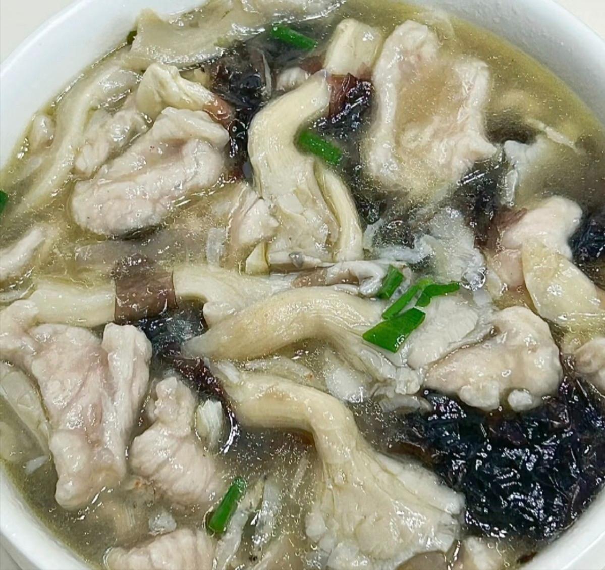 食材:紫菜、平菇,瘦豬肉,姜絲、蔥花,鹽、白胡椒粉、淀粉
