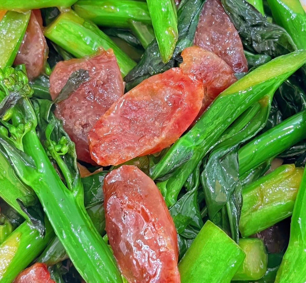 食材:芥藍,臘腸,蒜末,鹽、白糖
