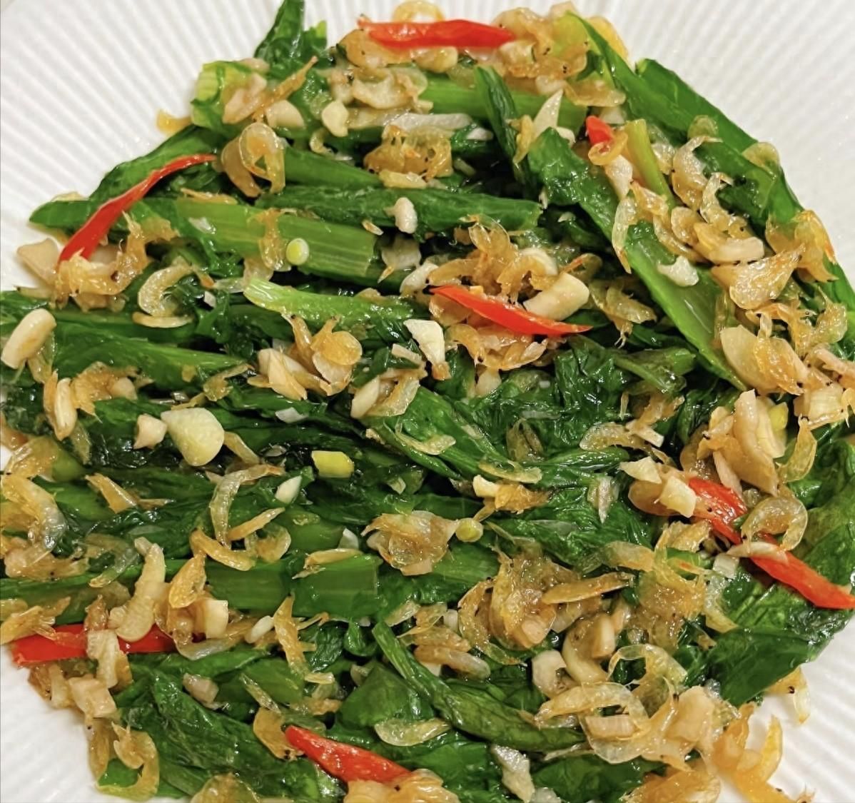 食材:油麥菜,蝦皮,小米辣,蒜末,鹽、生抽