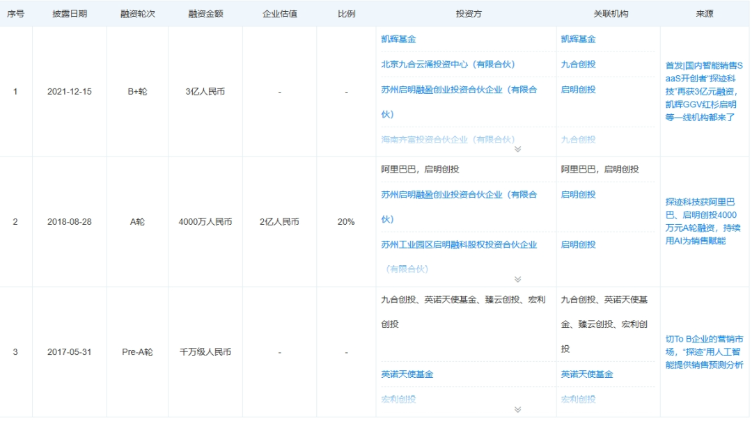 天眼查顯示,探跡科技成立之后曾有過3次公開融資,累計融資約5億元,其資方包含阿里巴巴、紅杉中國、九合創投、啟明創投等明星機構的身影。
