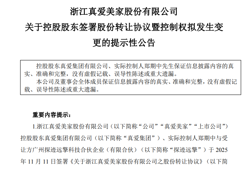 11月11日,紡織制造企業真愛美家(003041.SZ)發布的公告顯示,AI科技企業“探跡科技”將通過旗下主體“探跡遠擎”,以約18億元的價格收購真愛美家44.99%的股權。