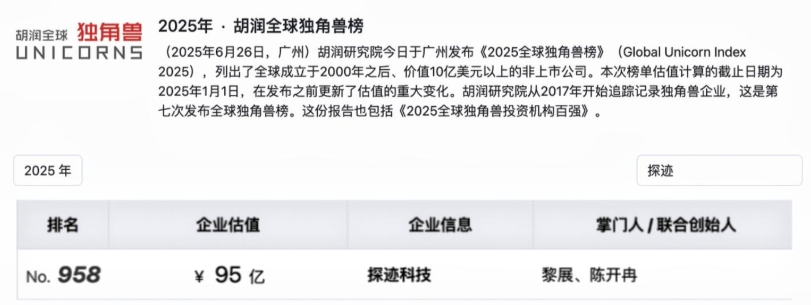 在公告中,探跡科技對于資金來源僅表示自有或自籌資金,不過探跡科技成立以來并未直接披露過財務和盈利狀況。2025年11月胡潤研究院發布的《2025全球獨角獸榜》顯示,探跡科技估值為95億元。