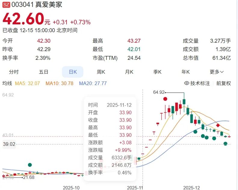 公告發出后,真愛美家股價連續多日上漲,半月之內漲幅近100%,股價從30元出頭漲到最高64.92元/股;截至12月15日,真愛美家報收42.6元/股,市值61.34億元。
