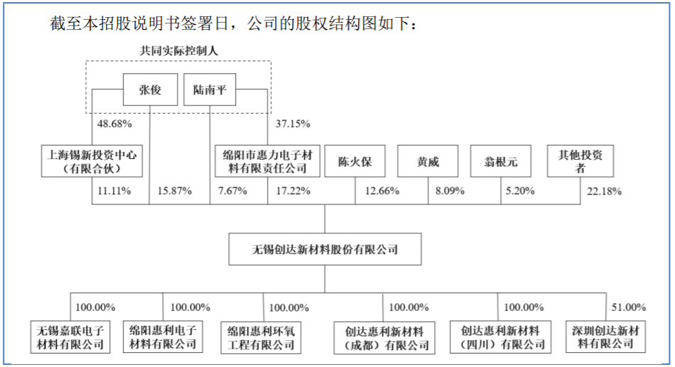 公司實際控制人為張俊、陸南平。其中,張俊直接持有公司15.8706%的股份,直接持有公司股東錫新投資48.6806%的出資份額并擔任錫新投資的執行事務合伙人,通過錫新投資間接控制公司11.1117%的股份,合計控制公司26.9823%股份所代表的表決權;同時,張俊擔任公司董事長兼總經理。陸南平直接持有公司7.6672%的股份,直接持有綿陽惠力37.1533%的股權,為綿陽惠力第一大股東并擔任執行董事,通過綿陽惠力間接控制創達新材17.2245%股份,合計控制公司24.8917%股份所代表的表決權;同時,陸南平擔任公司副董事長兼副總經理。