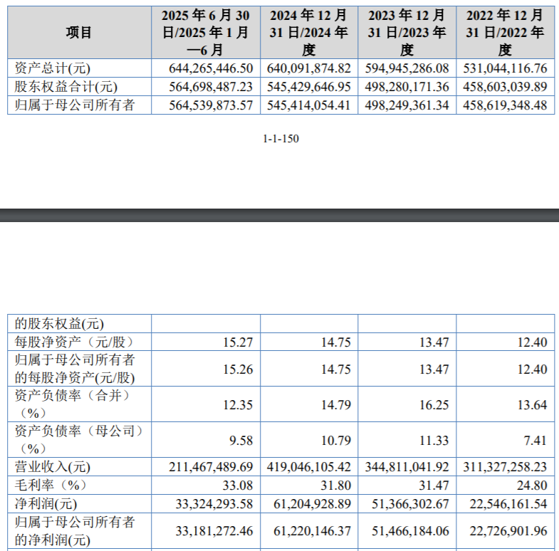 業績方面,2022年度、2023年度、2024年度和2025年1-6月(報告期內),公司實現的營業收入分別為3.11億元、3.45億元、4.19億元和2.11億元,歸屬于母公司股東的凈利潤分別為2272.69萬元、5146.62萬元、6122.01萬元和3318.13萬元。