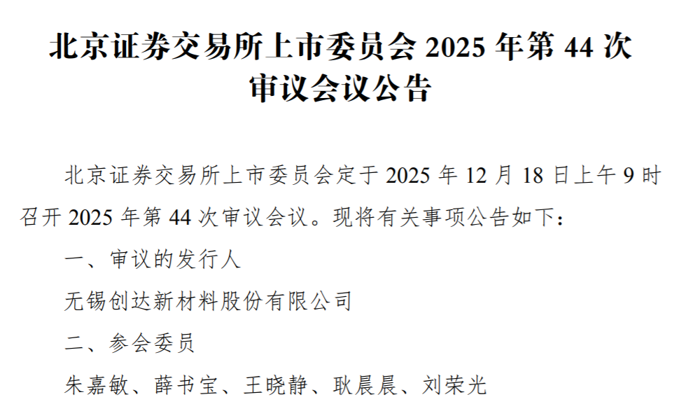 瑞財經 王敏 北交所上市委員會定于12月18日召開2025年第44次審議會議,審核無錫創達新材料股份有限公司(以下簡稱“創達新材”)首發事項。