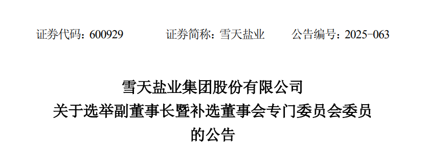 公告顯示,雪天鹽業集團股份有限公司當日召開第五屆董事會第十三次會議,審議通過《關于選舉副董事長暨補選董事會專門委員會委員的議案》。經與會董事審議和表決,同意選舉董事陳偉為公司第五屆董事會副董事長,并補選其為第五屆董事會戰略委員會和提名委員會委員,任期自審議通過之日起至第五屆董事會屆滿。