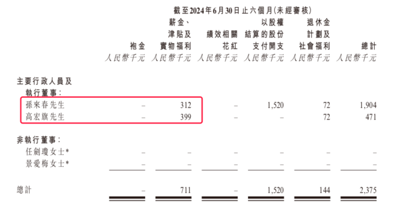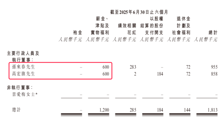 2025年上半年,總裁孫來春、副總經理高宏旗薪金、津貼及實物福利合計都是60萬元,較去年同期大幅上漲。