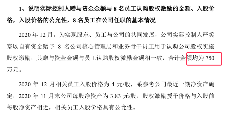 2020年12月,為實現股東、員工與公司的共同發展,公司實際控制人嚴笑寒以自有資金贈予8名公司核心管理層和業務骨干員工用于認購公司股權實施股權激勵,其贈與資金金額與員工認購股權激勵金額相一致,合計金額均為750萬元。