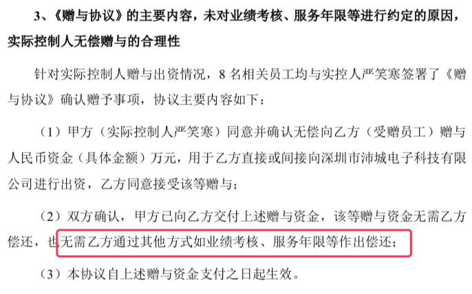 回復文件表示,贈與8名員工司齡均在15年以上,在公司發展歷程中作出了重要貢獻且均擔任公司重要崗位,嚴笑寒以自有資金贈予上述員工用于間接認購公司股權,其核心目的系針對員工歷史貢獻給予的認可和回報,通過激勵長期共同奮斗的員工實現股東、員工與公司的共同發展,因此贈與協議中未約定業績考核、服務年限,實際控制人對核心員工的無償贈與具有合理性。