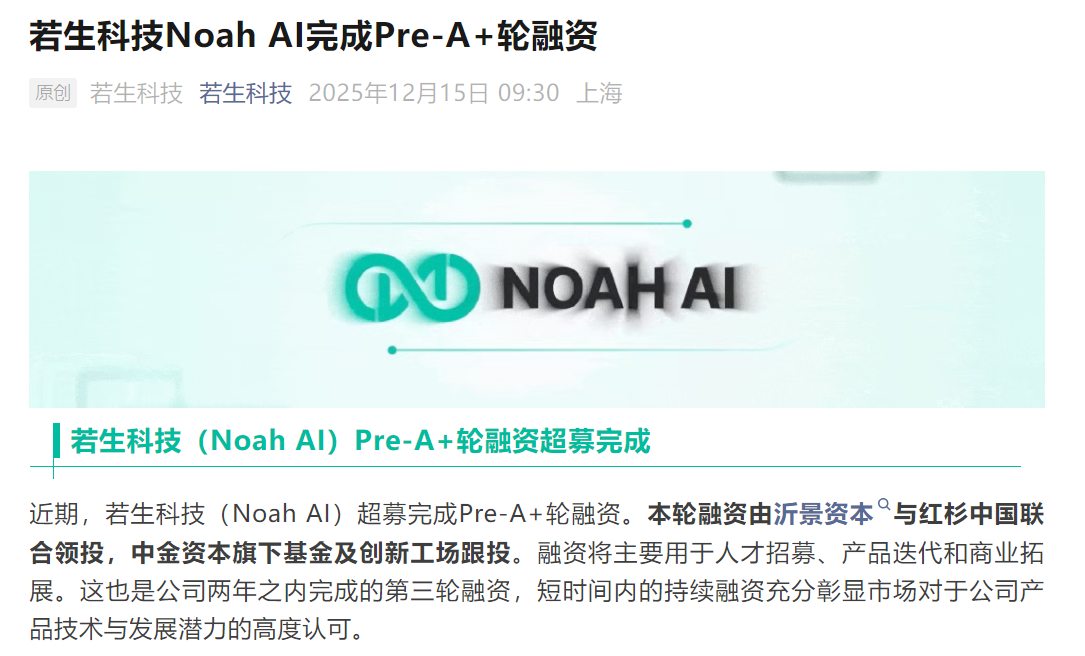 瑞財經 王敏 12月15日,北京若生智能科技有限公司(以下簡稱“若生科技”)官微宣布超募完成Pre-A+輪融資。本輪融資由沂景資本與紅杉中國聯合領投,中金資本旗下基金及創新工場跟投。