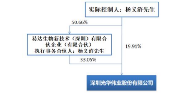 光華偉業控股股東為易達生物新技術(深圳)有限合伙企業(有限合伙),直接持股33.05%;楊義滸直接持有公司19.91%股份;同時作為易達生物執行事務合伙人間接控制公司19,039,301股股份,間接控制股份比例33.05%。因此,楊義滸合計控制公司52.96%股份,為公司實際控制人。
