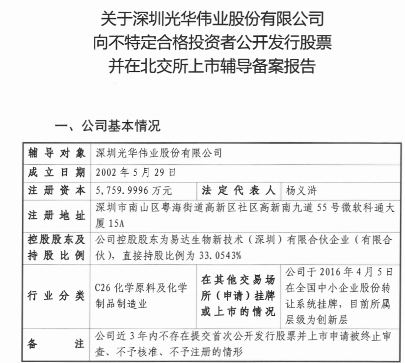 瑞財經 王敏 12月15日,深圳光華偉業股份有限公司(以下簡稱“光華偉業”)在深圳證監局啟動IPO輔導備案,擬北交所上市,輔導機構為申萬宏源證券承銷保薦。