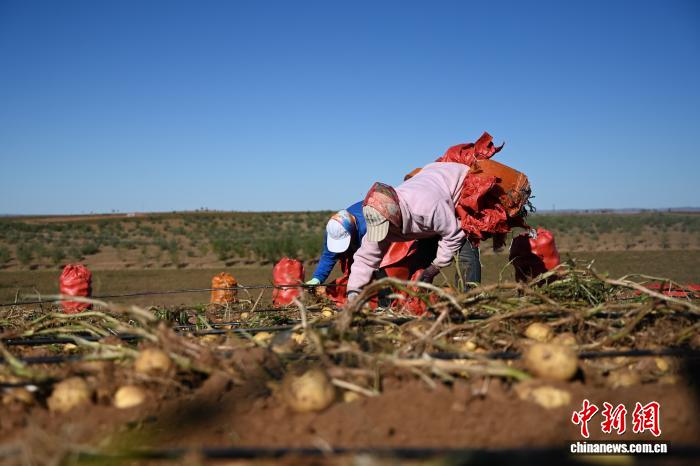 2022年9月23日,中國農民豐收節,內蒙古自治區呼和浩特市武川縣馬鈴薯田間,農民收獲馬鈴薯。中新社記者 劉文華 攝