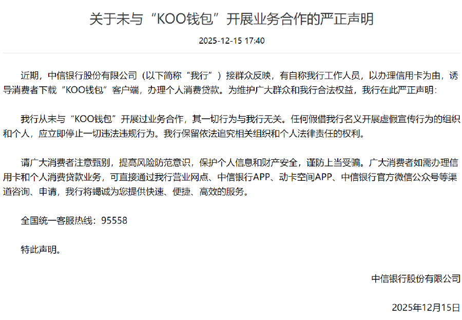 【大河財立方消息】12月15日,中信銀行發布聲明稱,近期接群眾反映,有自稱中信銀行工作人員,以辦理信用卡為由,誘導消費者下載“KOO錢包”客戶端,辦理個人消費貸款。