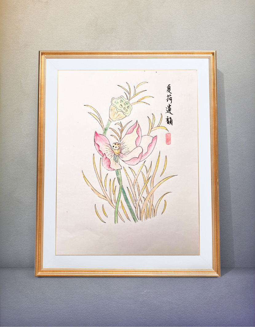 淺粉的荷瓣半舒著,把一朵軟乎乎的笑窩托在蕊心——那是藏在花瓣里的小歡喜;青嫩的蓮蓬還帶著新澀,裹著幾顆未醒的蓮子,細瘦的荷莖牽著黃綠的葉絲,像把夏的輕軟都織在了素紙上。墨色的字倚著紅印,把"夏荷遺韻"四個字浸成了慢下來的時光。